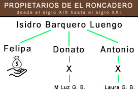 Como dato histórico adjuntamos aquí el árbol genealógico completo desde Isidro Barquero hasta sus actuales herederos. Los actuales propietarios de partes del Roncadero que no pertenecen a este árbol proceden de la parte que vendió Felipa.