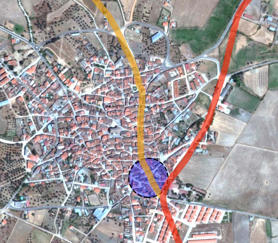 Cruce de calzadas y el círculo en el que inicialmente estaba Peraleda