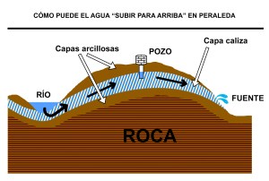 Eso se debe a la capa freática del subsuelo. Simplificando el asunto podríamos explicarlo del siguiente modo. El suelo que pisamos es de tierra hasta cierta profundidad, y luego está el lecho de roca. A su vez, la tierra está compuesta de capas. El agua baja hasta que llega a la roca y ya no puede bajar más, así que se va almacenando en las capas inferiores. Pero las capas del subsuelo no son todas iguales, algunas (como las arcillosas) rechazan el agua, y otras (como las calizas) absorben gran cantidad de agua como una esponja. Nuestro suelo está formado por calizas y arcillas. Imaginemos una especie de sándwich geológico formado por dos capas de arcillas y en medio una de caliza. El agua que consigue filtrarse por grietas y atravesar la capa arcillosa, llega a la caliza y la empapa. Ahora dejemos que las fuerzas geológicas plieguen estas capas formando una ondulación. En la superficie se verá un cerro, debajo tendremos que la capa caliza con agua se curva hacia arriba. El resultado es que debajo de la cumbre del cerro, igual que en su base, tenemos agua a pocos metros de profundidad. No es que el agua fluya hacia arriba, sino que la capa húmeda se curva hacia arriba y mantiene la humedad. Esa capa mojada es lo que llamamos “capa freática”. Por eso se podría dar la paradoja de que el agua del Tajo “suba” hasta llegar a Peraleda y allí pueda sacarse mediante la construcción de un pozo. El pozo en este caso sería un agujero que atraviese la primera capa arcillosa y llegase a la caliza. Allí, al abrirse un hueco, el agua que empapa la capa caliza se filtraría en el hueco y en poco tiempo lo dejaría totalmente anegado de agua. La capa arcillosa inferior sirve de suelo para evitar que el agua se vaya por abajo, tal como podemos ver en el dibujo siguiente: