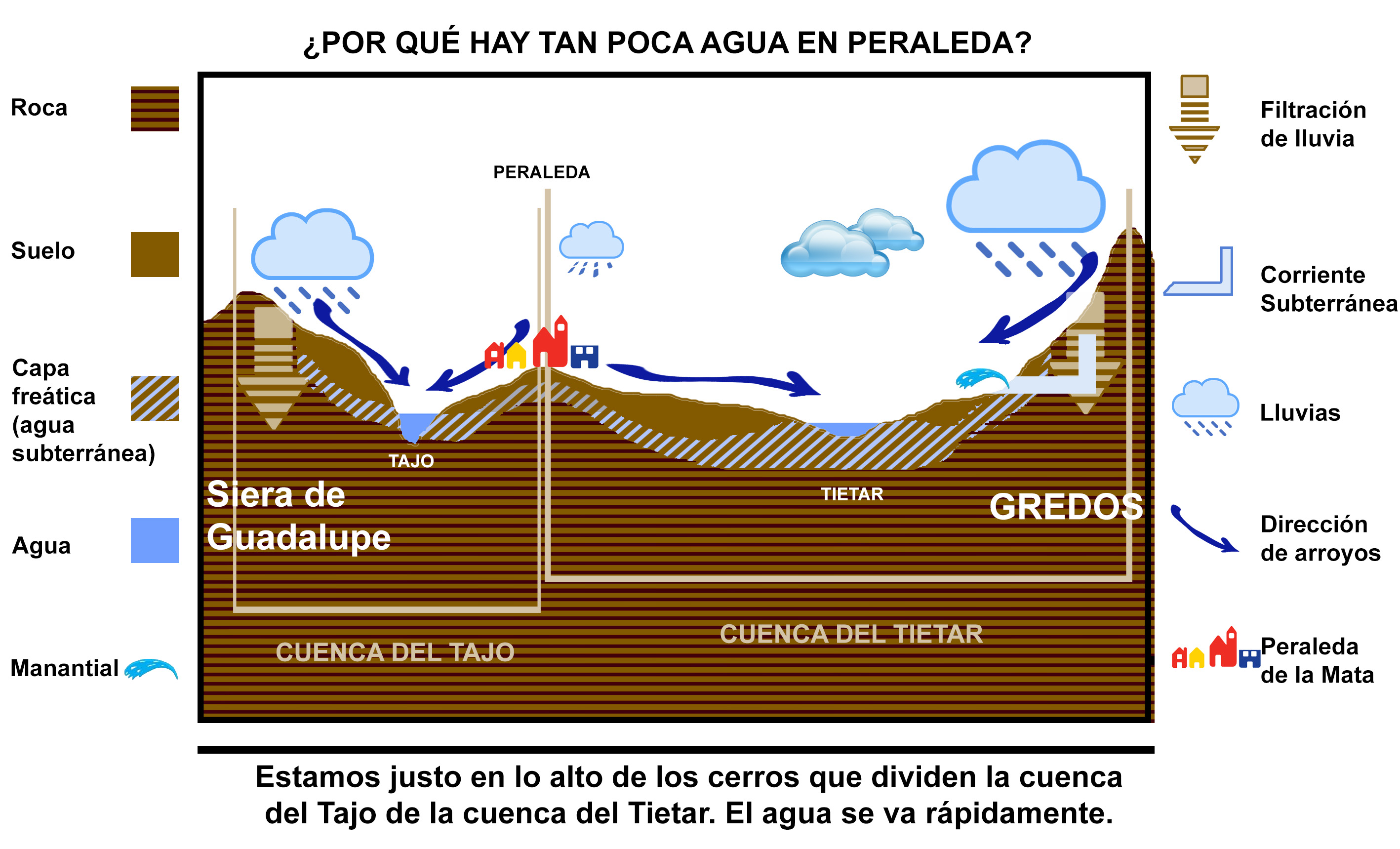Pero el agua de la lluvia no sólo corre por las calles o laderas, la mayor parte de ella se filtra al subsuelo y va poco a poco escurriendo en el interior de la tierra hacia tierras más bajas. En este caso nuestra situación es igual de mala, las aguas subterráneas no nos llegan de otras partes más altas porque las únicas tierras más altas que estos cerros son Gredos, cuyas aguas subterráneas procedentes de la lluvia o del deshielo de las nieves no nos pueden llegar porque caen antes en la cuenca del Tiétar, y los Montes de Guadalupe, que tampoco nos llegan porque se encuentran antes con el Tajo. Pero entonces ¿cómo es posible que existan aquí pozos de agua?