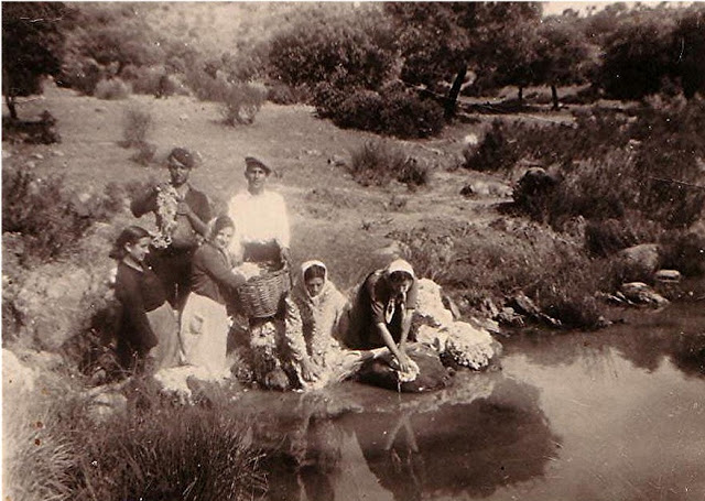 Íbamos al Arroyo e Santa María a lavar. Llevábamos la ropa mojada en un cubo, caliente, cuando era el invierno, para que las manos no se nos quedaran frías //¿caliente?// sí, con agua caliente llevábamos la ropa metida en un cubo de zinc, y luego la seca en un perol o un cesto a la cabeza. Llegábamos al arroyo e Santa María, buscabas un hueco donde ponerte, poníamos dos piedras y unos escobones de… pa ponerte de rodillas. Ahí ponías la ropa de color. //¿escobones encima de las piedras?// No, escobones para ponerte de rodillas. Ponías dos piedras, una tal que aquí (horizontal) pa que no te diera el agua y otra para hacer el lavadero, porque no los había hechos y lo tenías que hacer. Te ponías a lavar y la ropa de color encima de los escobones, te ponías de rodillas, lavabas la ropa blanca, la ibas sacando del cubo pa que las manos no se te quedaran frías y se ponían a solear en los vallaos, pa que el sol la diera, y luego ya que pasaba un rato, saltábamos, bailábamos, nos comíamos un cacho pan y morcilla si llevabas en la merendera con el queso un poco, y nos contábamos nuestras historias de las amigas, y ya aclarábamos la ropa y la poníamos en las tamujas //¿y la ropa la golpeabais o…?// la ropa se cogía, te ponías a lavar, hacías chun-chun, rin-rin-rin, lavabas, echabas la ropa al agua, cogías el rollo de jabón, jabón casero, le restregabas, rin-rin, hala, la tirabas asín la sábana, se iba la sábana con el agua, “hué”, la cogías otra vez, la tendías, y ya que estaba un rato soleándose, pa que estuviera blanca puesta al sol, asín en los vallados la ponías, la aclarabas y la ponías en las tamujas (escobón de río), las ponías encima y ya cuando estaban secas las doblábamos, las ponías en el cesto, doblaitas, y ponías unos cachitos, de tomillo o lo que hubiera, ahí encima y te olía bien la ropa, y te venías con la ropa a tu casa tan garbosa. Y cuando no había agua en el arroyo íbamos a La Bomba. Normalmente la gente del pueblo se iba a lavar pa… ¿ves donde está el molino…? más abajo, por encima de La Bomba, por ahí, un camino que sale por ahí por donde está la residencia (de ancianos), íbamos un camino por ahí p’arriba por ahí, te ibas al arroyo, y luego ya cuando… ¡se me queman las costillas co/o! (…)