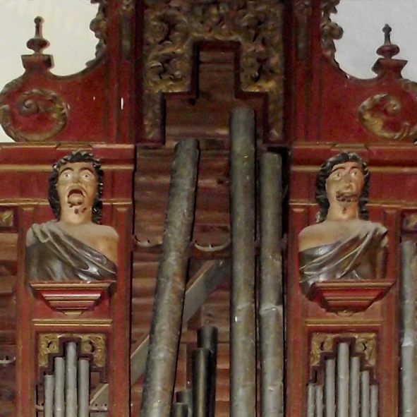 • En la fachada aparecen dos mascarones, conocidos vulgarmente como los mamarrachos de la tribuna, que abren la boca y cuya misión es expulsar el aire sobrante. Aparecen separados por cinco tubos. A uno y otro lado de estos mascarones van otros seis tubos y debajo de ellos otros seis. Todos ellos van estéticamente colocados como podemos ver en la fotografía que acompañamos.