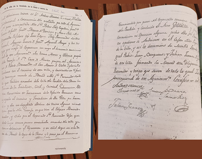“mandó su Merced a dicho Sr. Procurador Síndico que recibiese a nombre de la villa dela Peraleda de la Mata la Possesión de la Jurisdición, Civil y Criminal , Gubernativa, Política, Económica et Interesante de los referidos therrenos como agregados al término y Jurisdición de dicha villa por haber sido y ser un despoblado absoluto sin vecino alguno ni más casa que la de la Granja en que vive el Religioso Administrador, y oído por el expresado Sr. Procurador dijo : que desde luego estaba pronto arecibirla anombre dela villa y común de vecinos q. representa y en señal de que así se la dava su Merced le cogió de la mano el y le paseó por el terreno reconociéndole por parte del expresado término dela Peraleda y concluido el acto,,,…..”